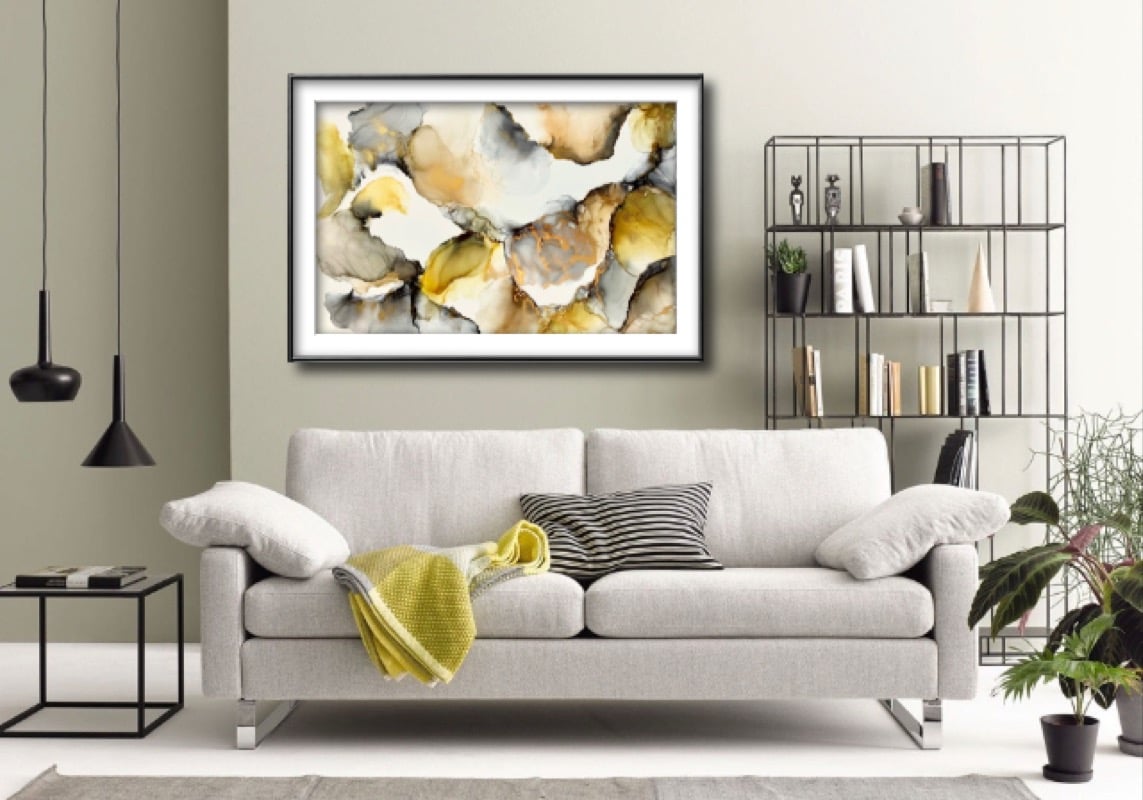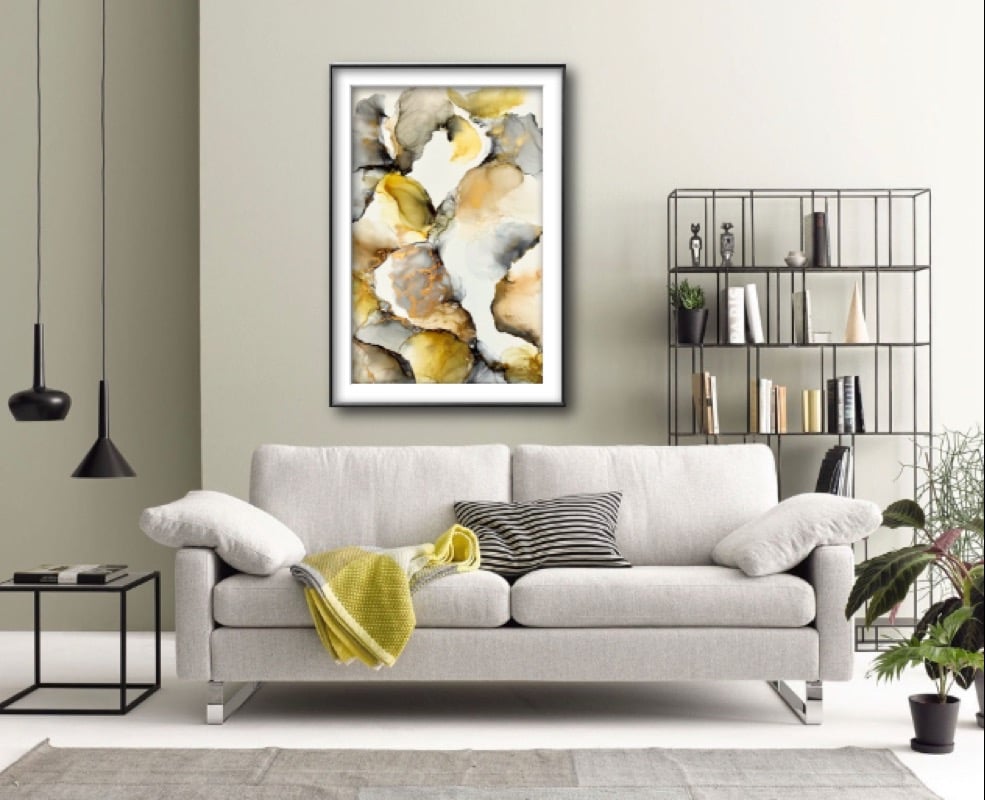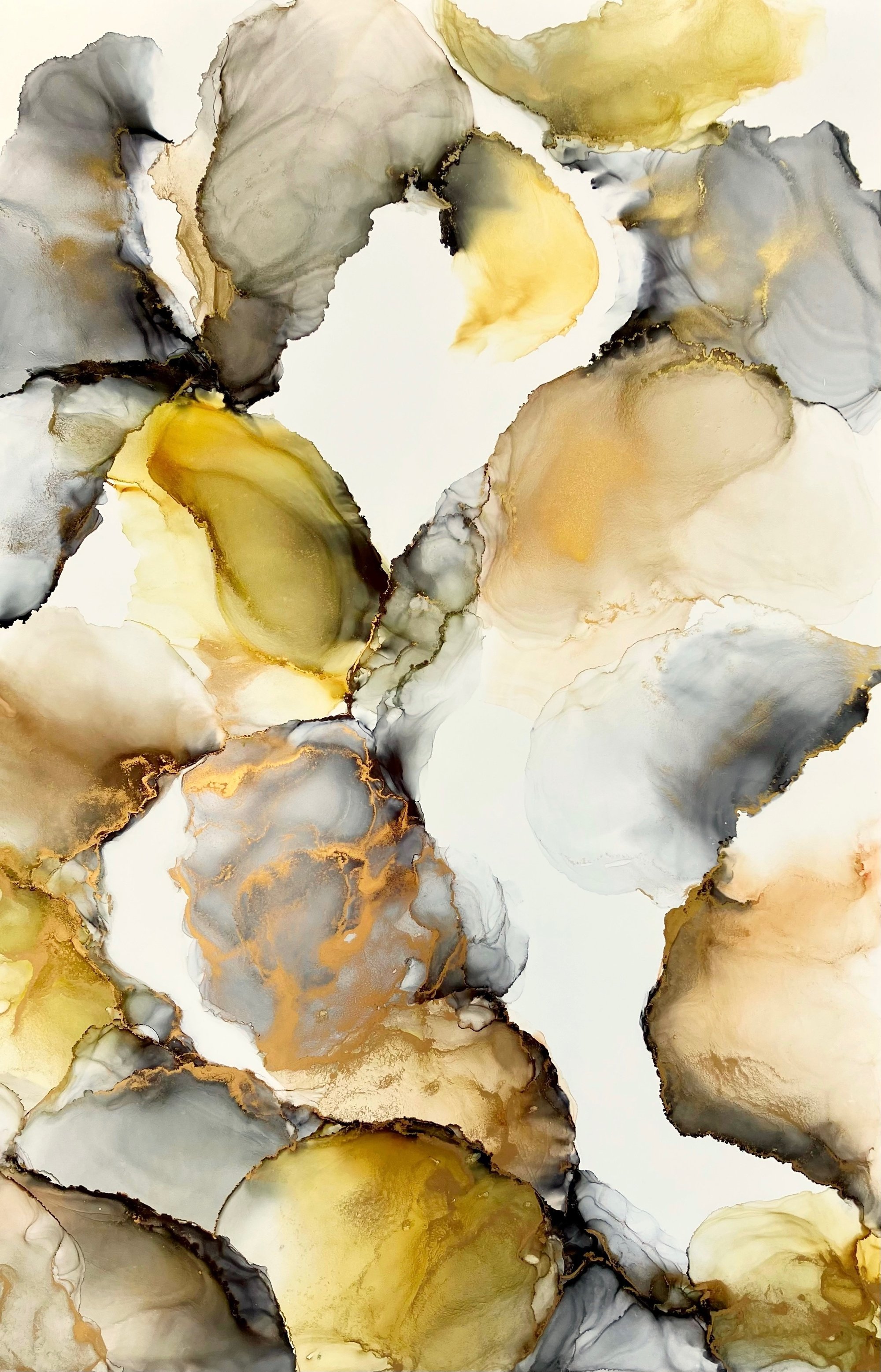24"x36" alcohol ink on synthetic paper. Warm yellow, rust and black with metallic brass to help it shine in any room!