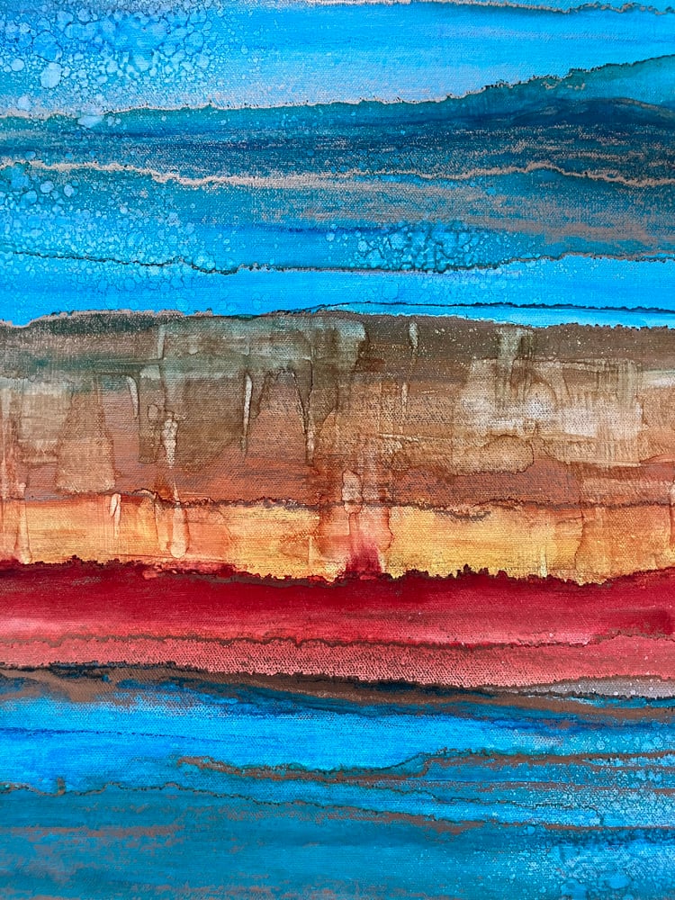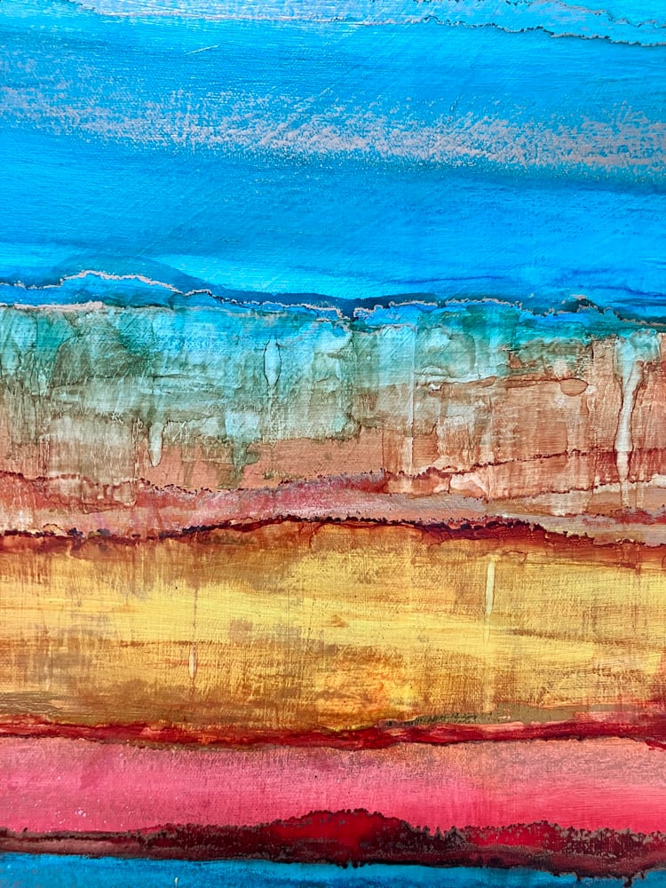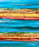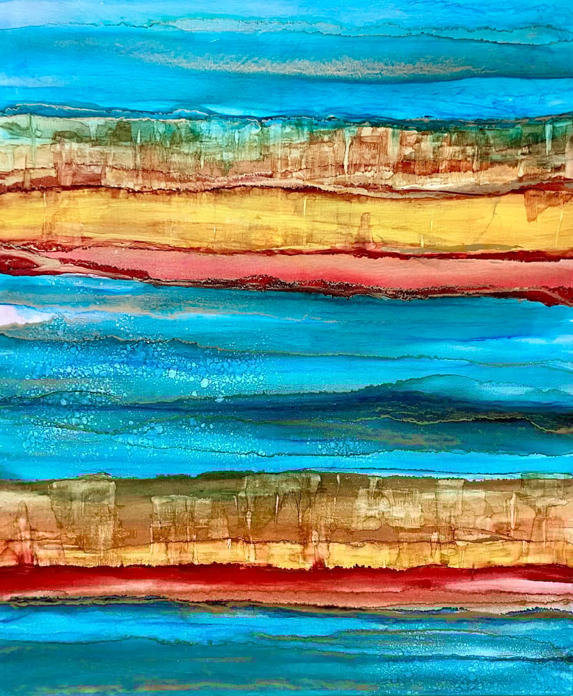 Layered bands of color highlighted with metallic echo the earth’s natural record of time—each stratum built, buried, and revealed. Balancing fluid movement with structure, the piece reflects how time settles into form.